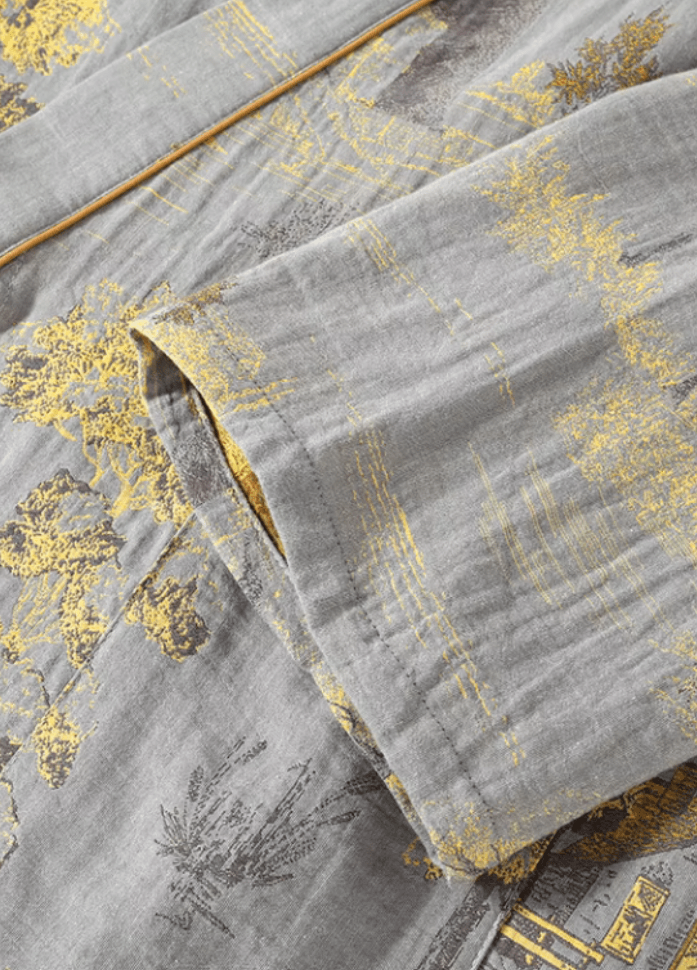 Le kimono à manches trois-quarts présente une coupe croisée traditionnelle avec col châle, fermeture par liens assortis et une poche latérale pratique. Le pantalon confortable à taille élastique complète parfaitement l'ensemble.