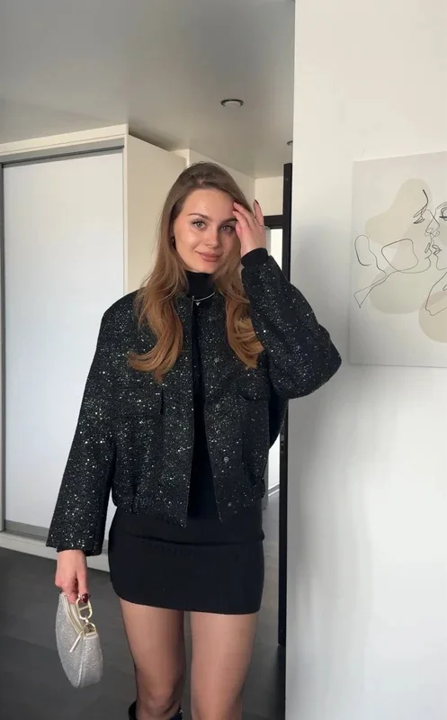 The small, flat, shiny sequins are sewn onto the fabric with a complex weave mixing bouclé thread, sequins and metallic thread giving this sparkling effect. The cut is straight and slightly oversized, with a short length stopping at the waist.